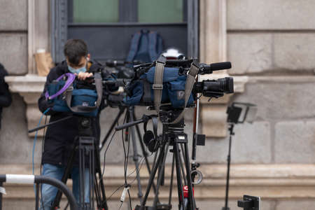 Madrid, Spain - Oct 28, 2020: Cameras and television tripods, prepared to record at the exit of the Congress of Deputies
