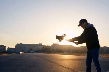 Young man filming with camera and gimbal. Portrait of videographer at beautiful sunrise.