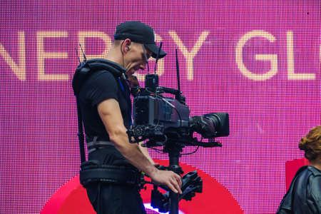 Saint Petersburg, Russia - October 4, 2019: Steadicam camera man online broadcasting from stage