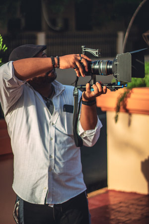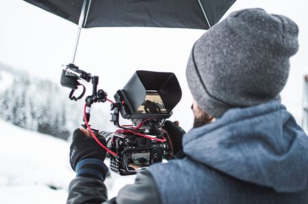 behind the scene cameraman shooting the film scene with his camera on outdoor location