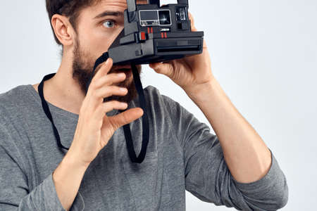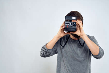 photographer with camera hobby technology studio lifestyle creative light background