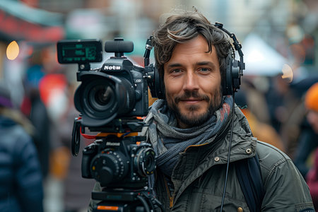 Smiling Filmmaker Operating a Professional Camera in a Busy City Street