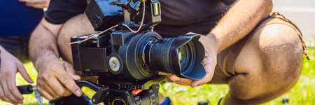 a professional cameraman prepares a camera and a tripod before shooting. BANNER, long format