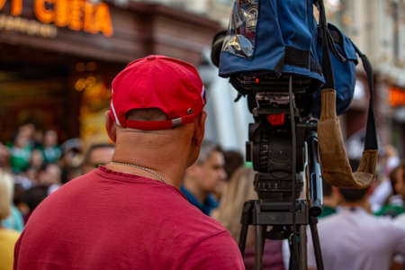 Moscow, Russia - August 31, 2017: Operator preparing tv camera to the live broadcast