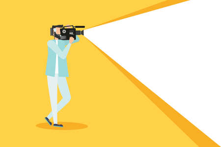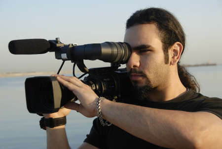 Professional videographer with his camcorder camera on field