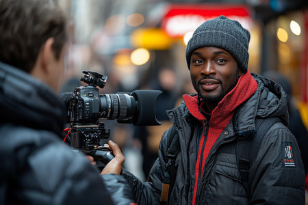 Man interviewed on city street, camera crew filming