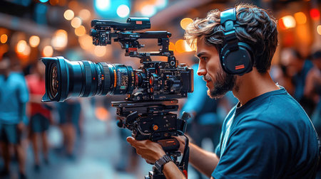 Skilled Man cameraman filming. Cinema tv set. Generate Ai