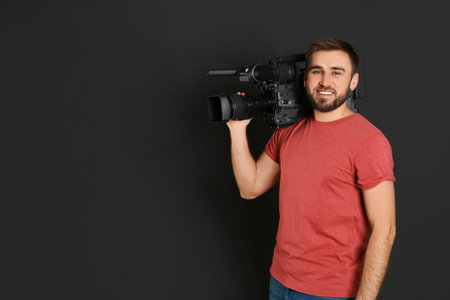 Operator with professional video camera on black background, space for text