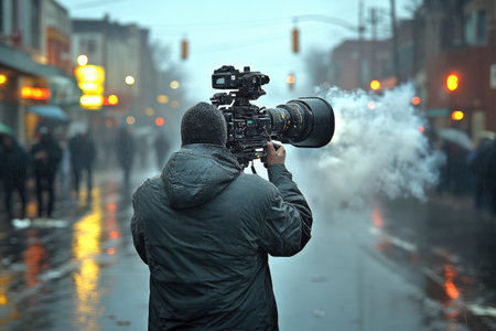 A Cameraman Films in the Rain and Smoke