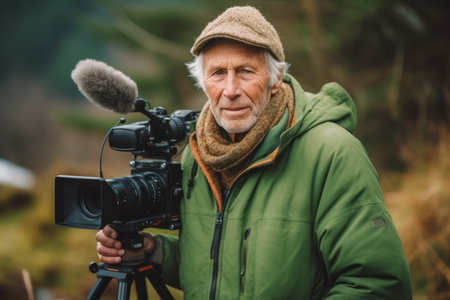 Portrait of senior man with video camera on tripod in autumn forest