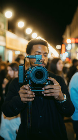 Young male videographer filming urban nightlife scene with professional camera surrounded by vibrant city lights and bustling crowd.