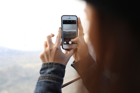 The young man is holding a mobile phone, taking pictures of the scenery at Pha Nok Aen. Phu Kradueng National Park, Loei Province
