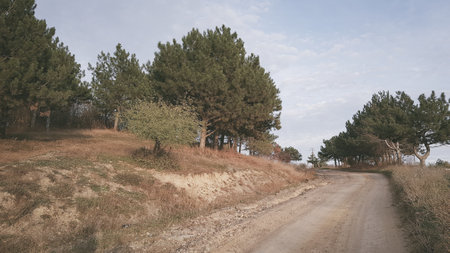 Autumn landscape of pine trees on the road to the sea.