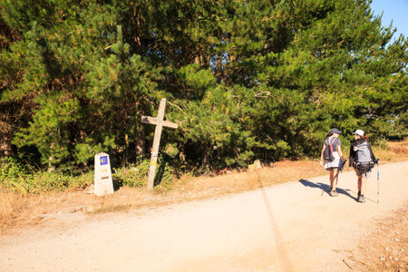 Pilgrim walks along the Camino de Santiago (Sant James Way) carrying a backpack next to a column with the shell symbol of the Camino Santiago de Compostela