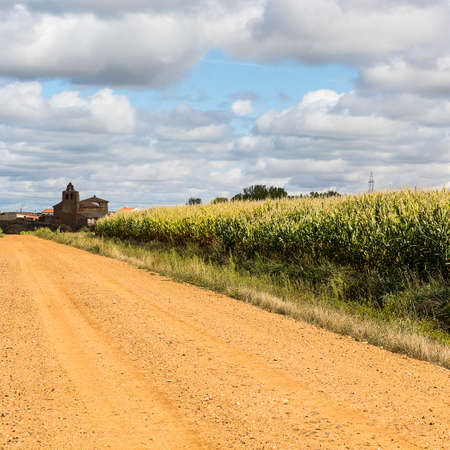 Autumn fields in Spain before harvesting. Service dirt road for agricultural production. Old Spanish church on the edge of the cornfield