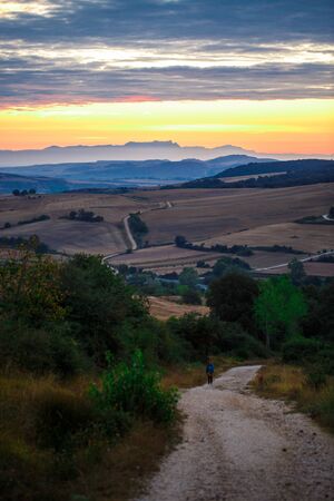 The Camino de Santiago during sunrise in Navarra, Spain. High quality photo