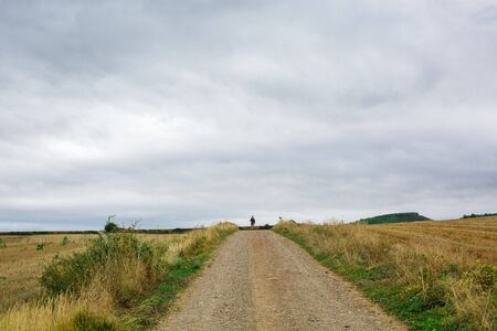 Lonely Pilgrim with backpack walking the Camino de Santiago in Spain, Way of St James