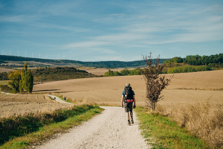 NAVARRE, SPAIN - OCTOBER 2022 pilgrim walking in French Way Camino Frances to Santiago de Compostela. High quality photo