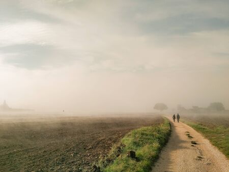 Country view in the middle of fog with a couple walking o a road