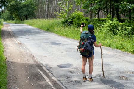 Young woman pilgrim taking a selfie on a trail of the way of saint james. Camino de Santiago