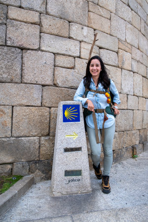 Young woman pilgrim beside signpost of the Way Saint James, marks shells for pilgrims to Compostela Cathedral