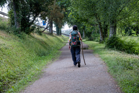 NAVARRE, SPAIN - OCTOBER 2022 pilgrim walking in French Way Camino Frances to Santiago de Compostela. high quality photo