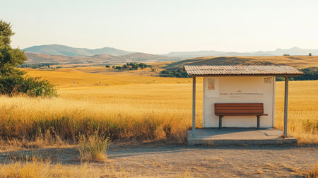 Quiet rural bus stop with a bench and basic shelter, surrounded by golden fields under the morning light.