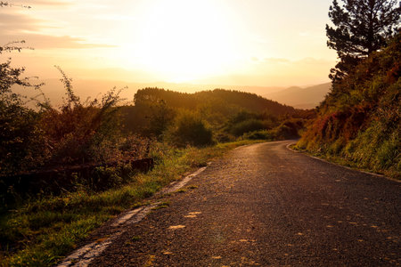 Scorching summer road to Sollube in the Basque Country: As the sun sets over the hills, the winding asphalt radiates intense heat, with a fiery orange glow casting over the landscape.