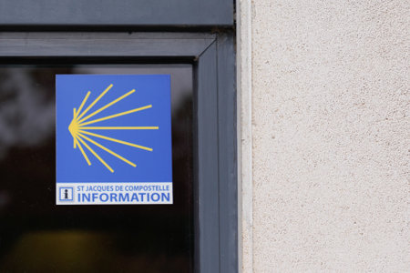Toulouse, ocitanie France - 06 30 2021: Camino de santiago waymark sign and logo pathway roadsign to Santiago de Compostela in windows office information tour