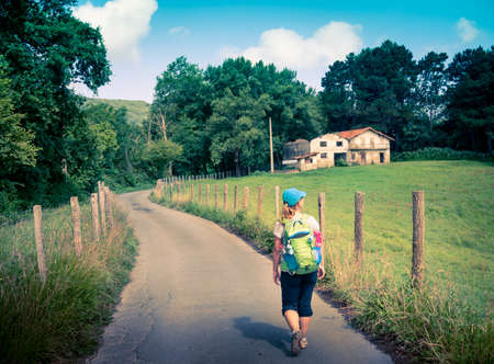 Young woman pilgrim walking on a trail of the way of saint james. Camino de Santiago