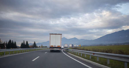 Refrigerator truck driving on the highway with Sierra Nevada in the background covered with clouds.