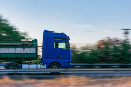 Truck with three axles driving fast on the highway with the rest of the moving image, creating a speed effect.