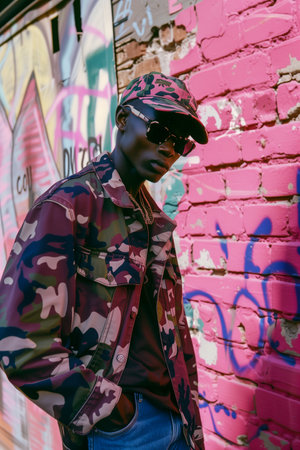 A man in a camo jacket stands in front of a wall covered in graffiti. He is wearing sunglasses and a hat