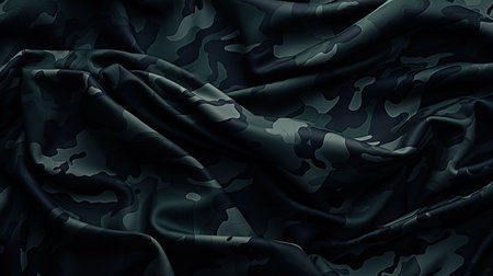 The fabric displays a complex camouflage pattern, blending dark greens and blacks artistically.