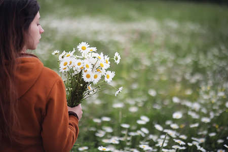 Cute red-haired girl in a chamomile field with her back, light mood, silence, peace, rest, peace of mind, warm toning