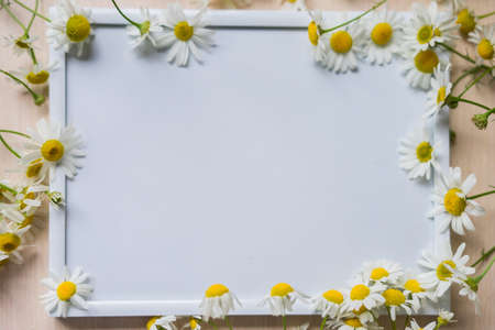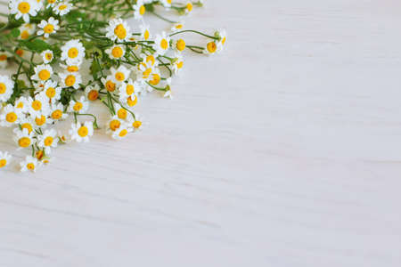 Beautiful daisy flowers on a white wooden background. Flat lay. Place for text.