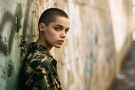 Two women in uniforms radiate strength and unity against a textured backdrop.
