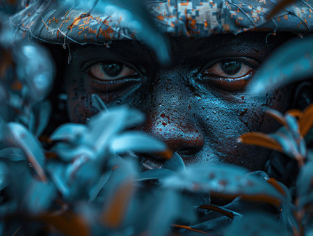 Close-up of a soldier's face with camouflage hat and green eyes peering through leaves