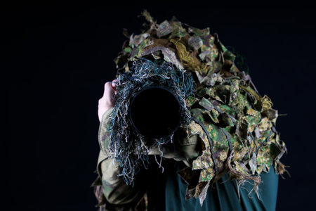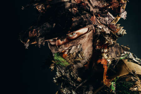 a male hunter face in panama hat and guillie forest camouflaged suit.