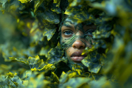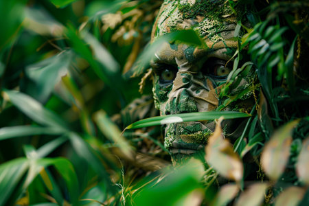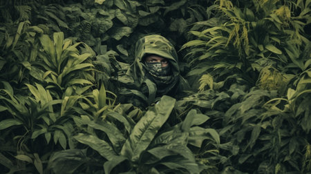 A figure seamlessly blends into the lush foliage, showcasing natures incredible and mesmerizing camouflage artistry. Generative AI