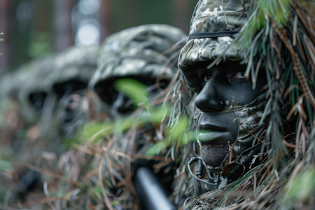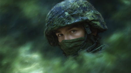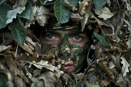 A soldier camouflaged in dense foliage, quietly observing the surroundings during a military training exercise in a woodland setting