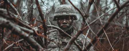 Grimy soldier camouflaged amidst trees capturing the somber essence of warfare. Concept War Photography, Somber Warfare Portraits, Camouflaged Soldier, Grimy War Scenes