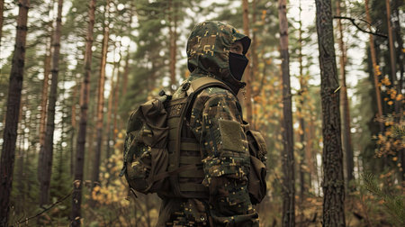 A soldier dressed in camouflage and face mask stars intently, displaying fierce determination in a forest environment during dawn.