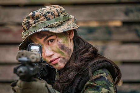 Detail shot with one soldier in camouflage uniform with hand behind his back holding his weapon