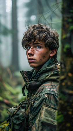 Portrait of a boy in camouflage in a dark forest. Selective focus.
