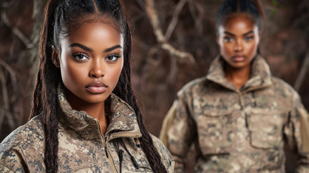 Two women in uniforms radiate strength and unity against a textured backdrop.