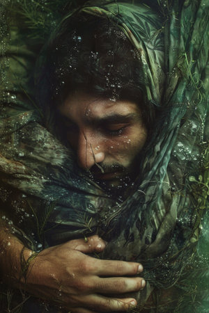 A man is wrapped in a blanket and appears to be crying. The image has a mood of sadness and loneliness