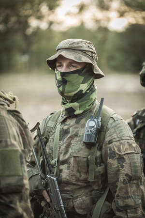 Portrait of masked soldier in military uniform