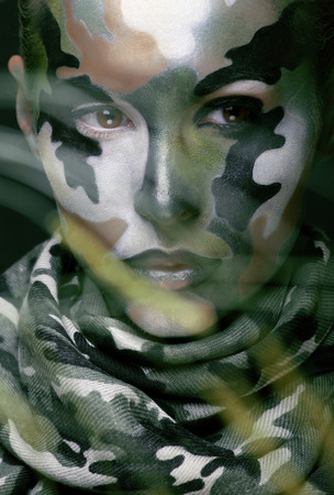 Beautiful young fashion woman with military style clothing and face paint make-up, khaki colors, halloween celebration