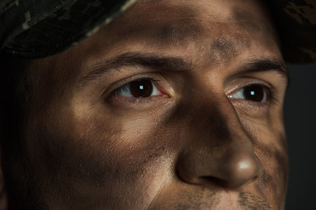 close up view of eyes of military man with dirt on face suffering from ptsd isolated on grey